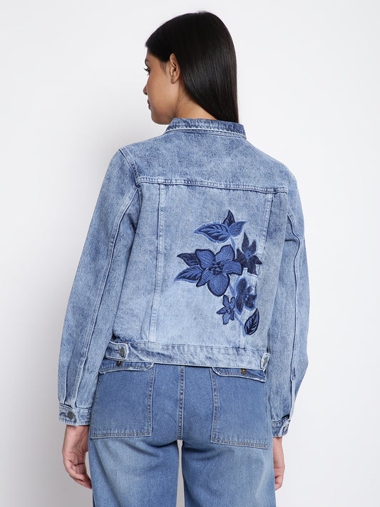 Women Light Blue Regular Fit Denim Cotton Tie & Dye Washed Jacket