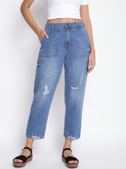Women Blue Paperbag Mom Fit Jeans