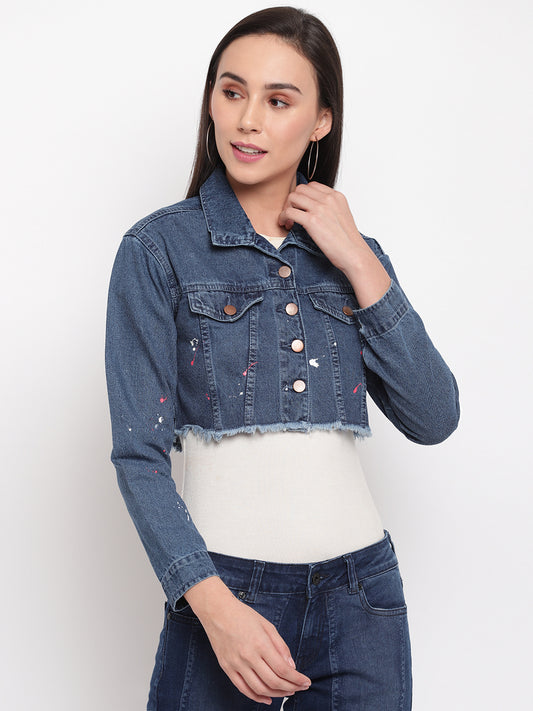 Women Dark Blue Fray Hem Cropped Denim Jacket
