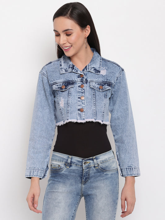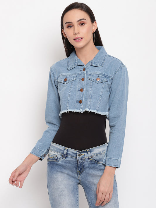 Women Light Blue Fray Hem Cropped Denim Jacket