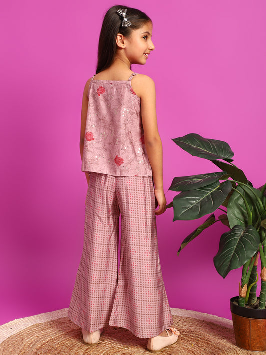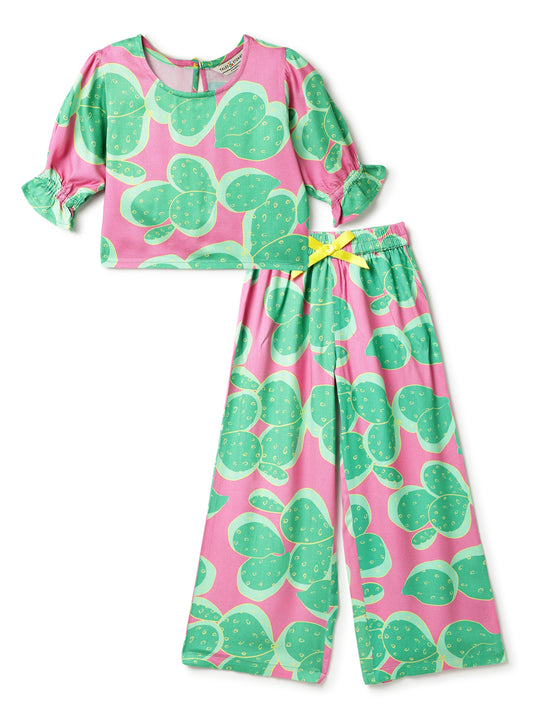 Girls Pink Rayon Printed Top With Palazzo Co-Ord Set
