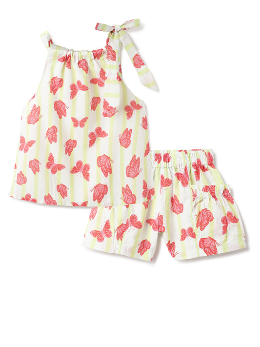 Girls Cotton Red & Yellow Stripes Printed Co-ords Set