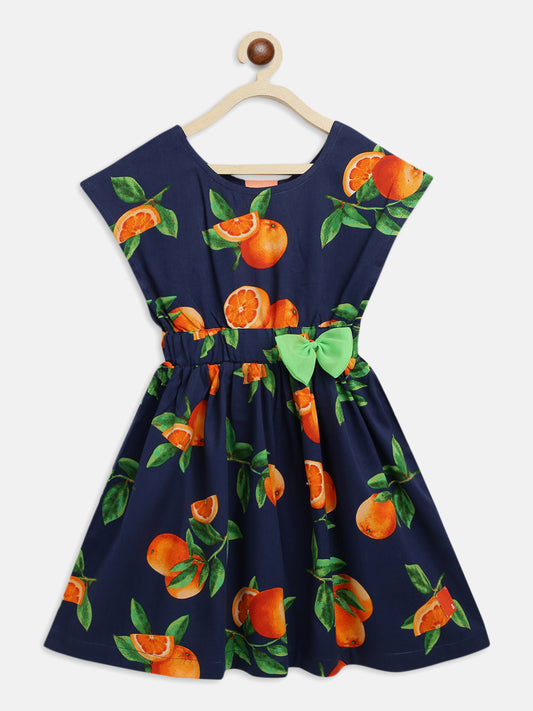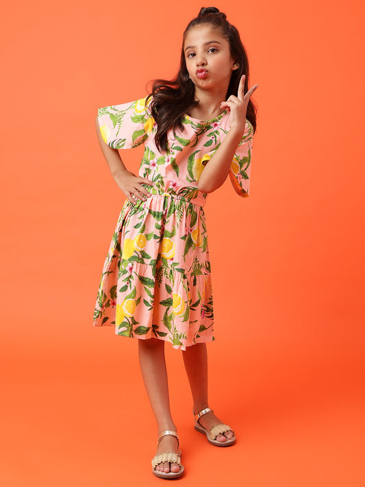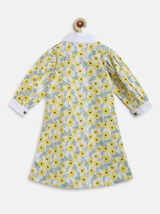 Girls Yellow 100% Cotton 3/4th Sleeve Regular Fit Print Dress