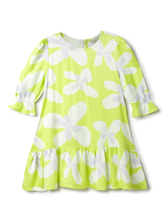 Girls Green Neon Viscose Floral Print Dress