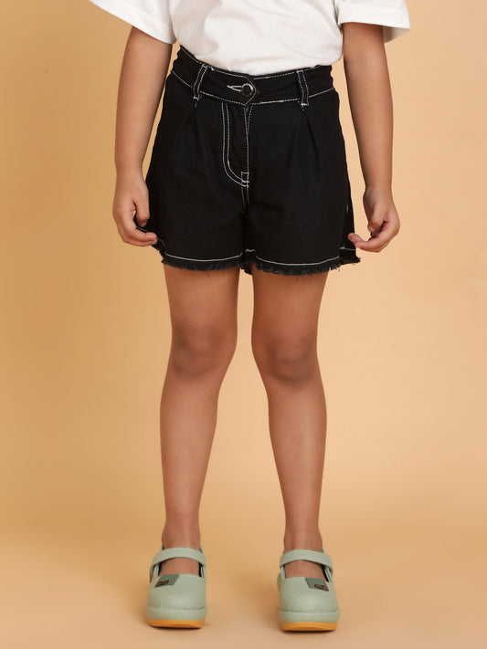 Girls Black Washed Cotton A-Line Above Knee Shorts