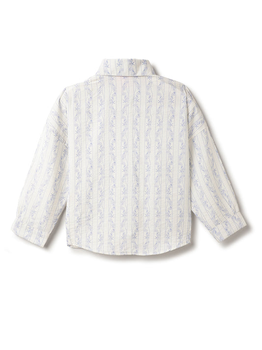 Girls Off White Viscose Polyester Stripes Printed Shirt