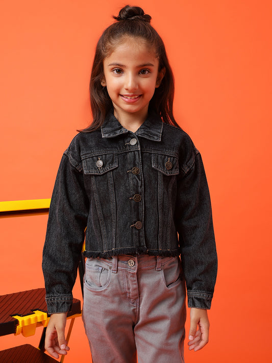 Girls Black Regular Fit Pure Cotton Towel Washed Jacket