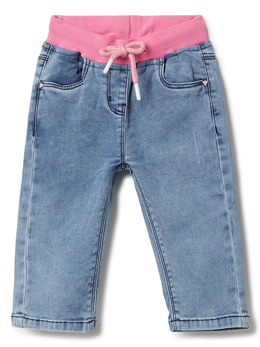 GIRLS SLIM FIT LIGHT BLUE CAPRI WITH PINK WAISTBAND