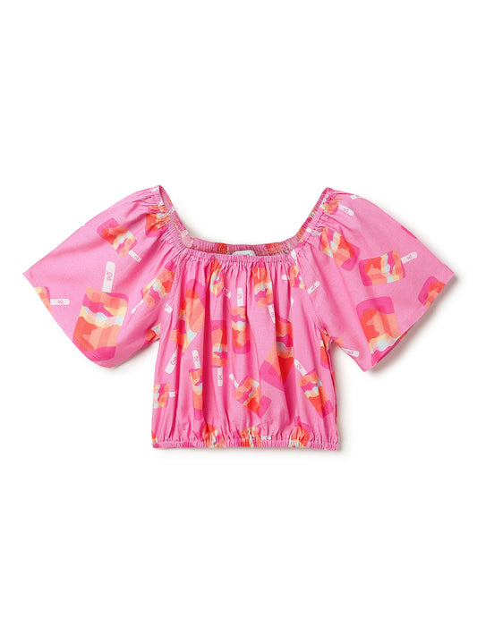 Girls Pink Printed Half Sleeve Round Neck Soft Viscose Crop Top