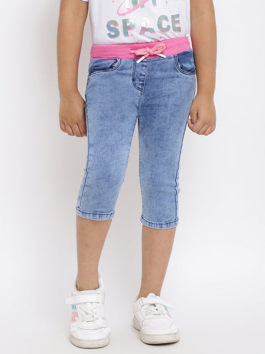 GIRLS SLIM FIT LIGHT BLUE CAPRI WITH PINK WAISTBAND