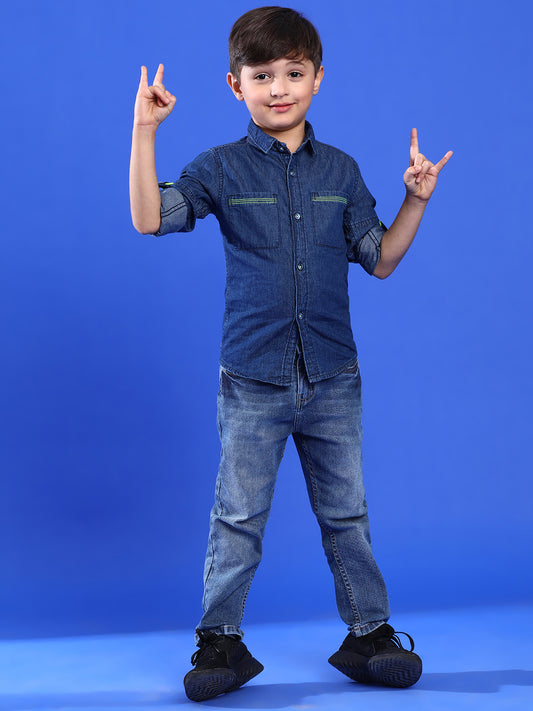 Boys Solid Dark Blue Cotton Regular Fit Full Sleeve Shirt