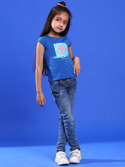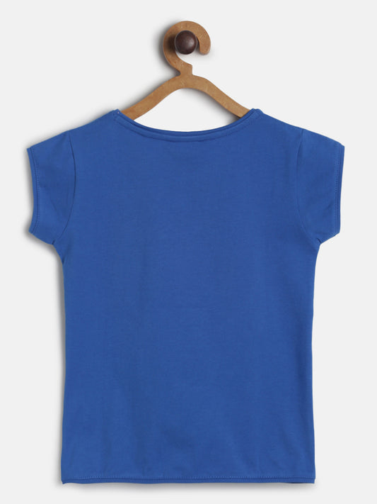 Girls Printed Royal Blue Cotton Regular Fit T-Shirts