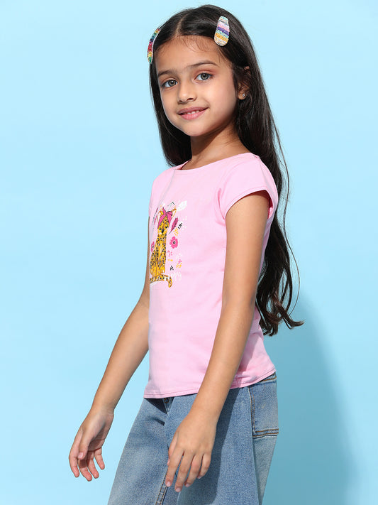 Girls Light Pink Lycra Printed Regular Fit T-shirt
