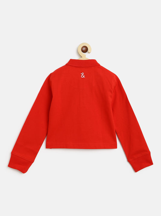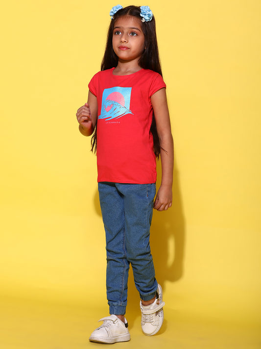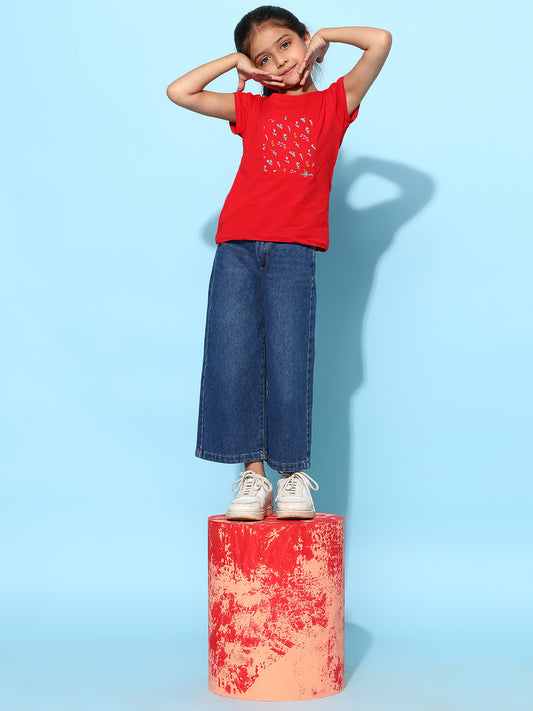 Girls Red Lycra Embroidered Regular Fit T-shirt
