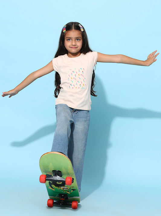 Girls Off White Lycra Printed Slim Fit T-shirt