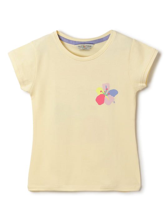 Girls Yellow Cotton Blend Embroidery T-shirt