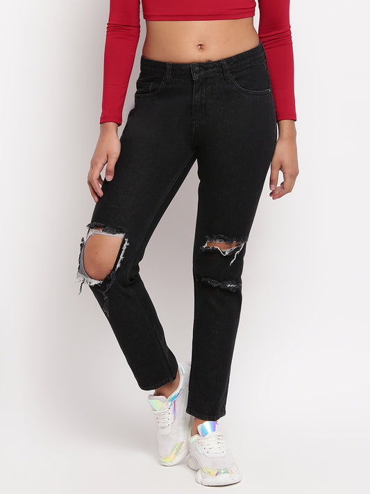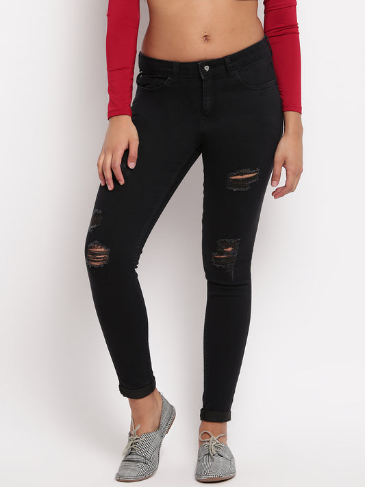 Women Black Mid Waist Skinny Fit Distressed Denim Jeans