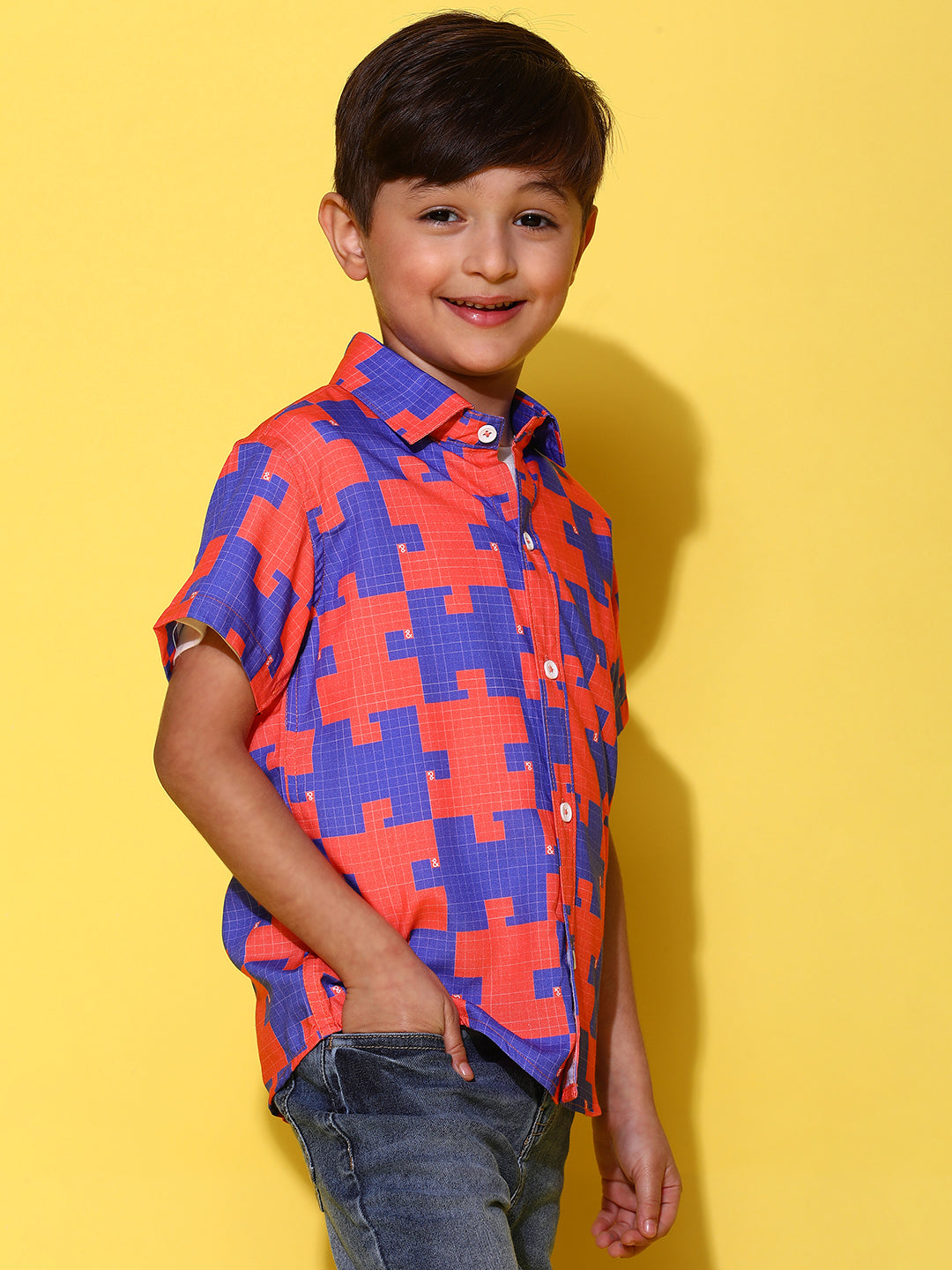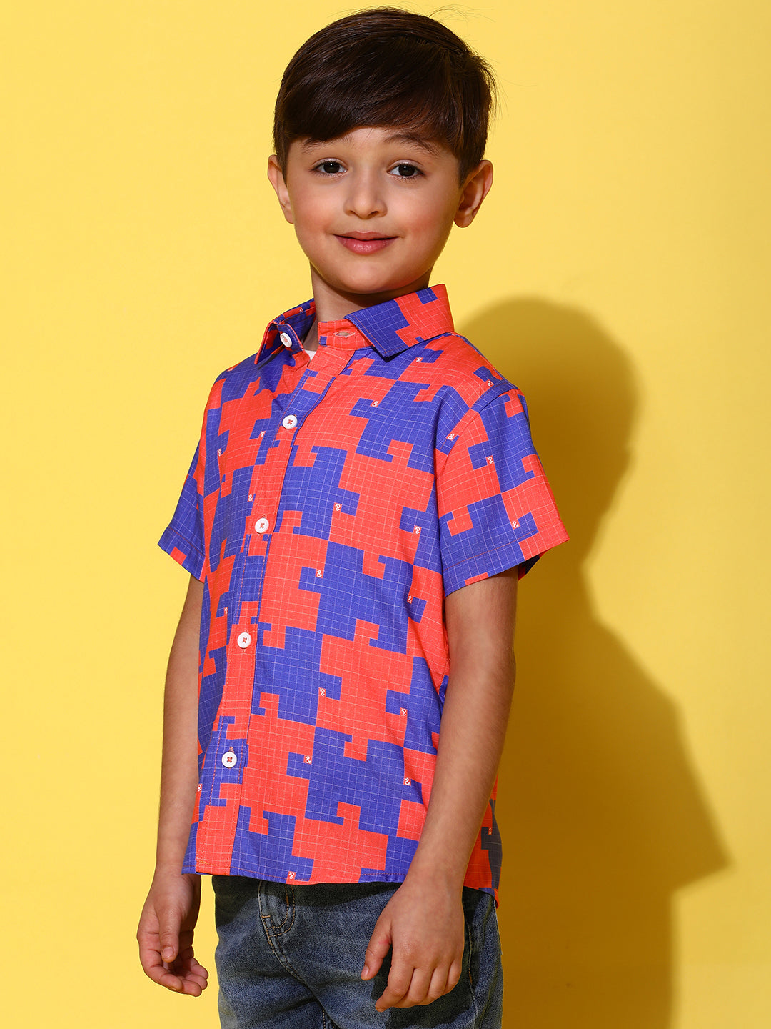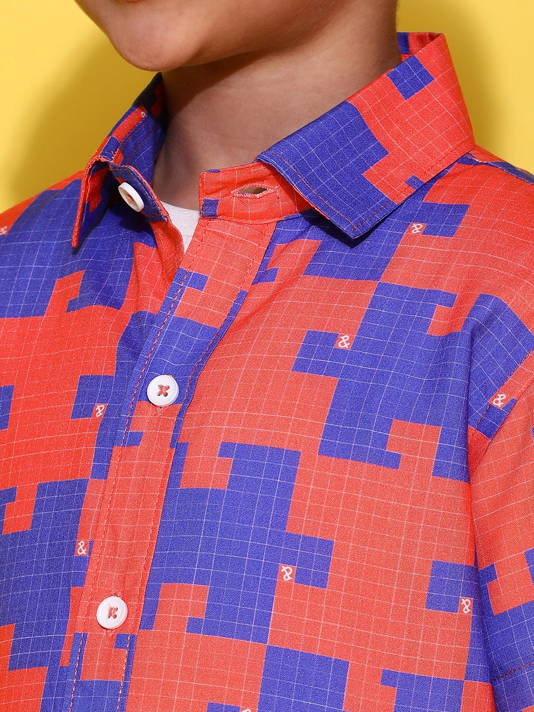 Boys Orange & Blue Half Sleeves Viscos Printed Regular Fit Shirt