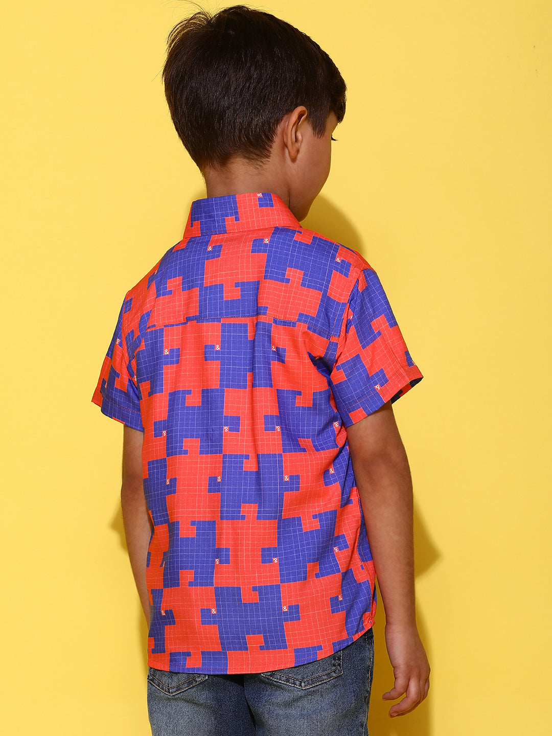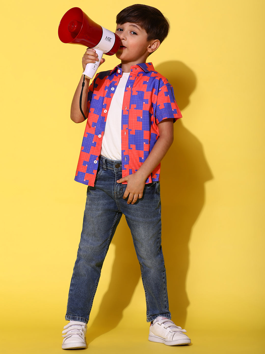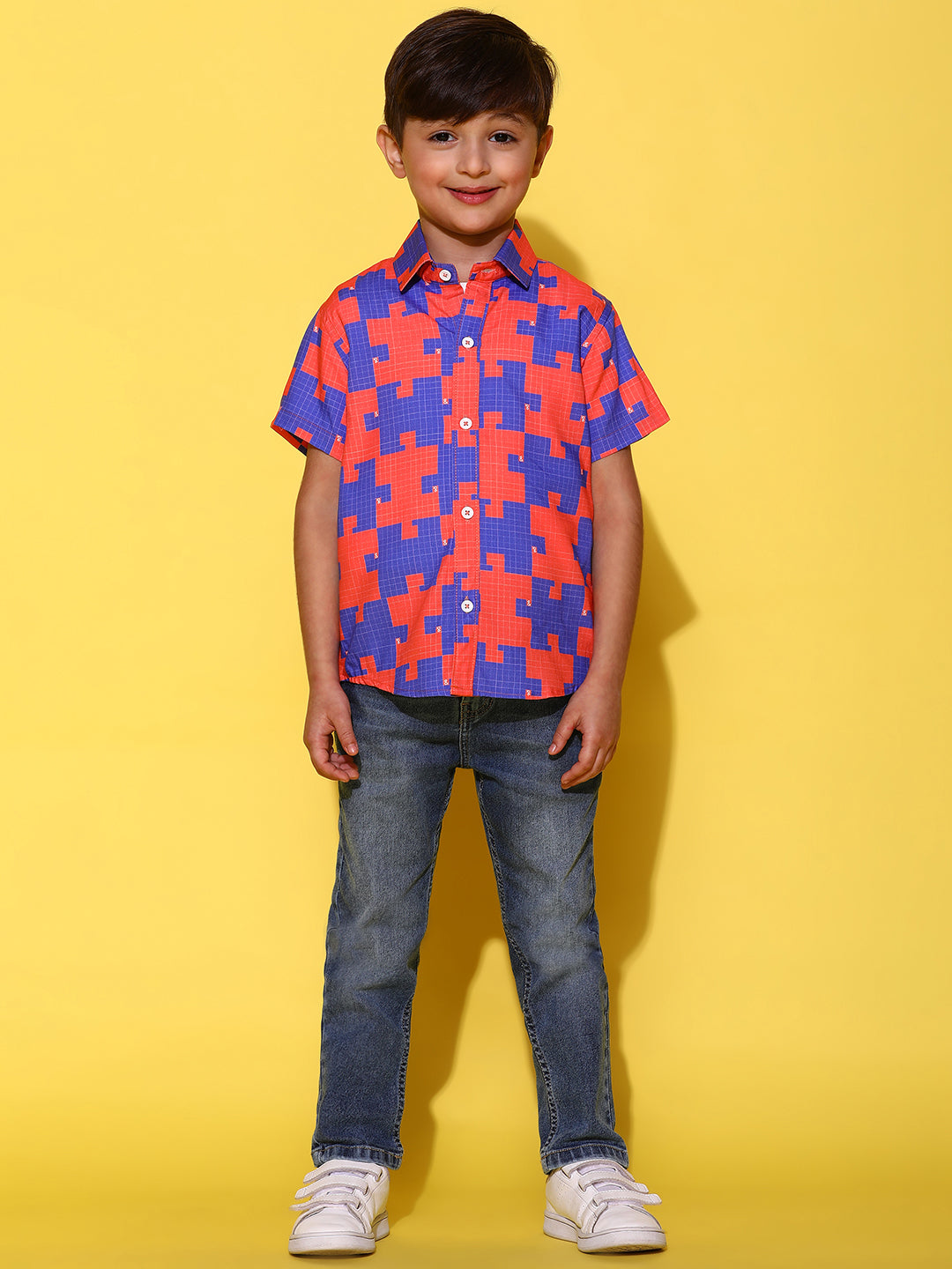 Boys Orange & Blue Half Sleeves Viscos Printed Regular Fit Shirt