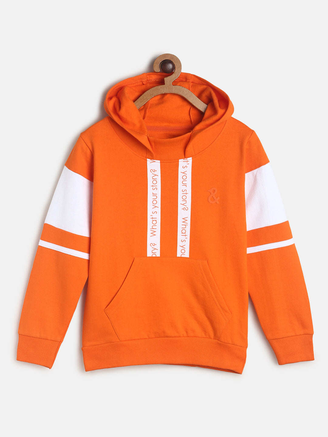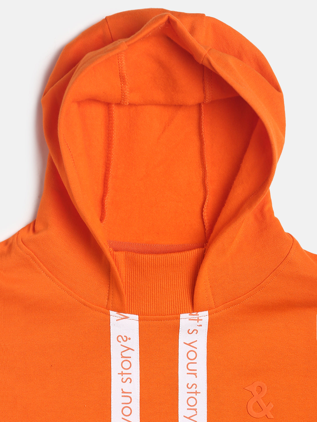 Boys Orange Poly Cotton Applique Full Sleeves Sweatshirt with Hood