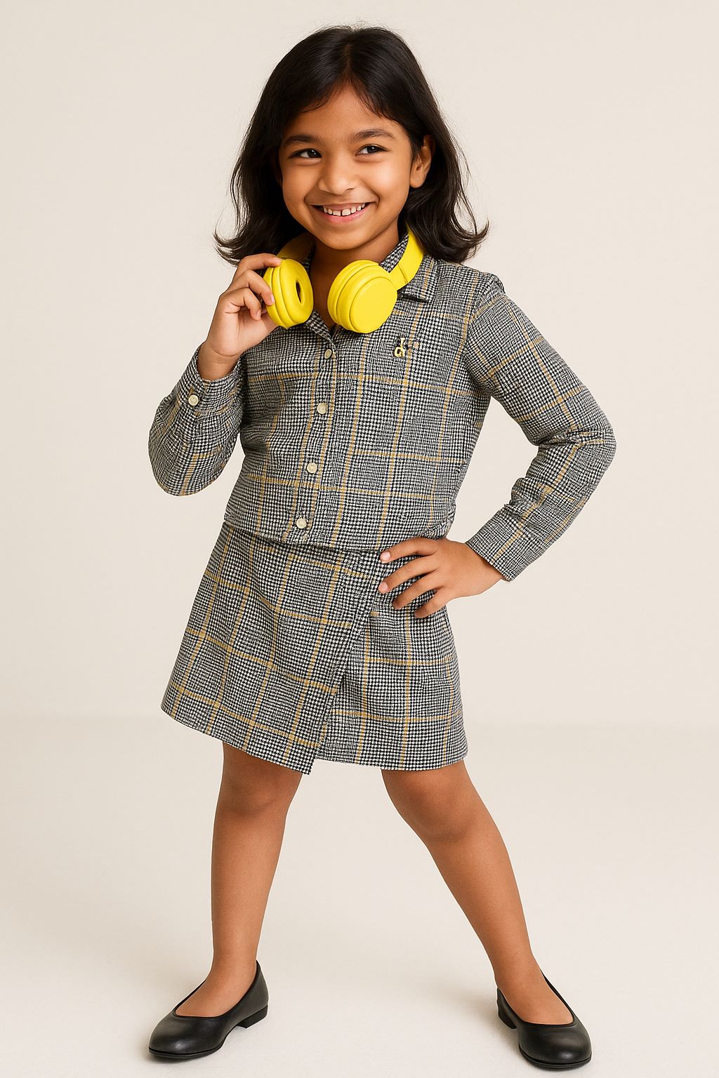 Girls Black Cotton Checks Crapped Shirt & Skort Co-Ord Set
