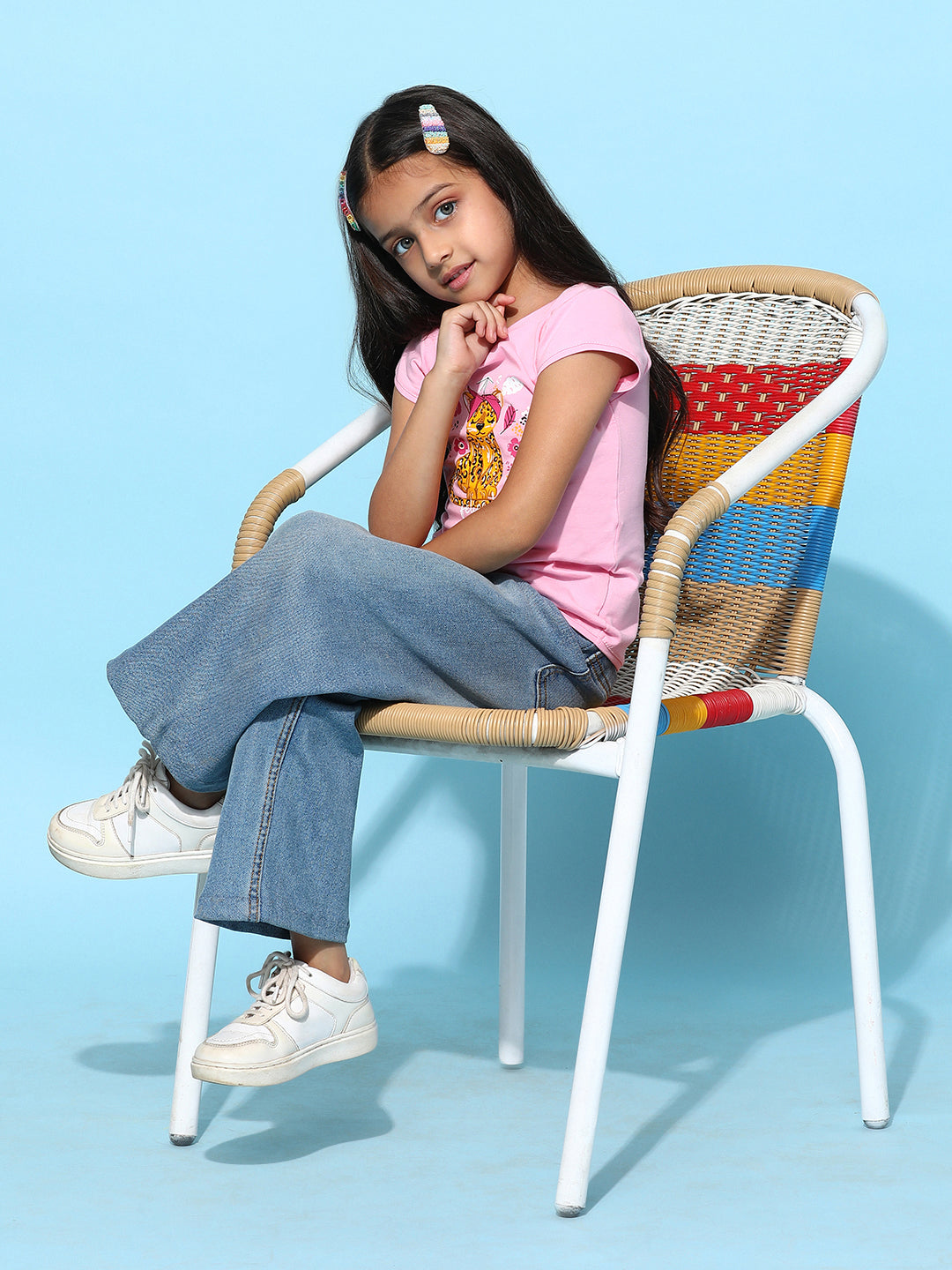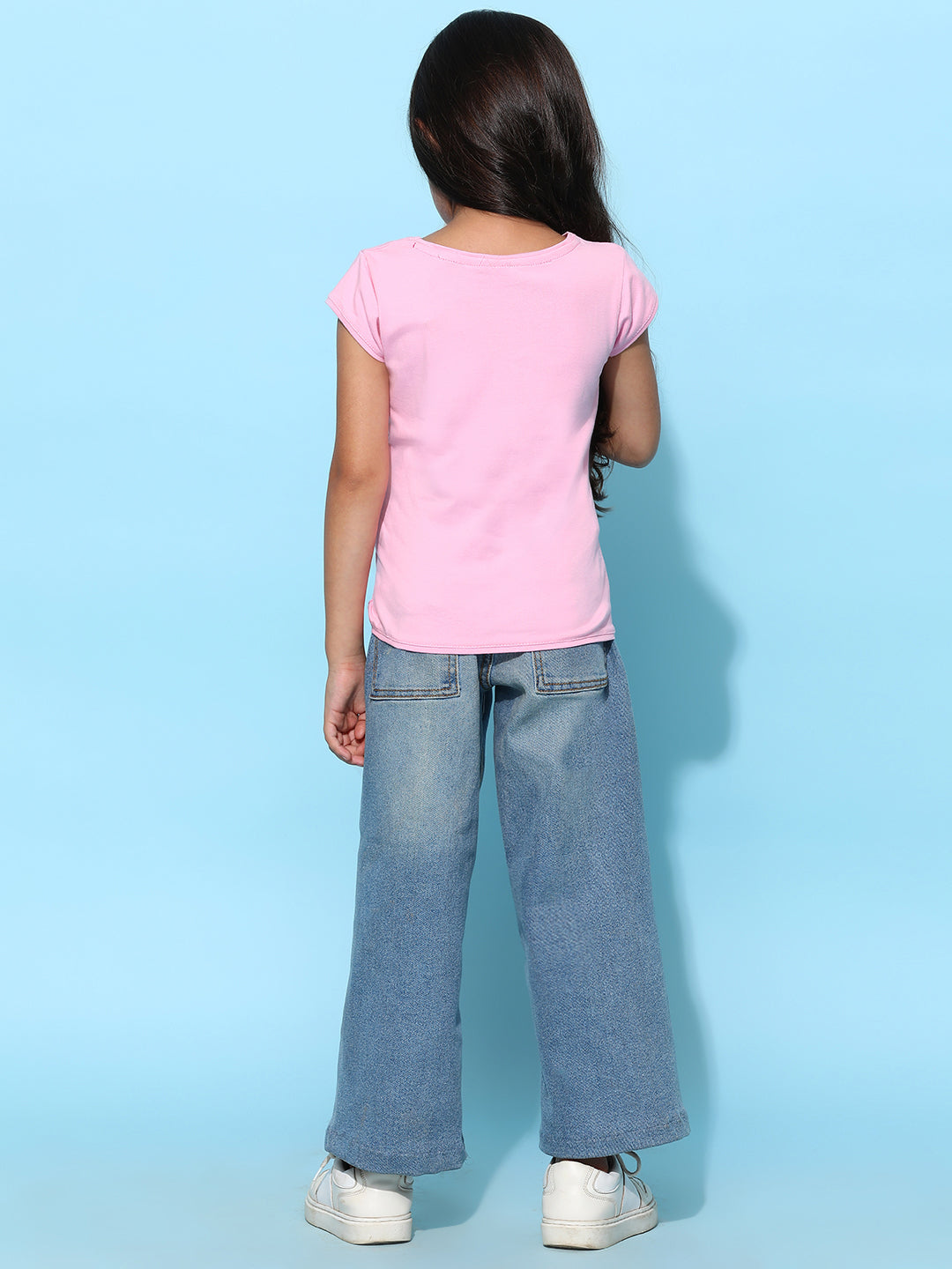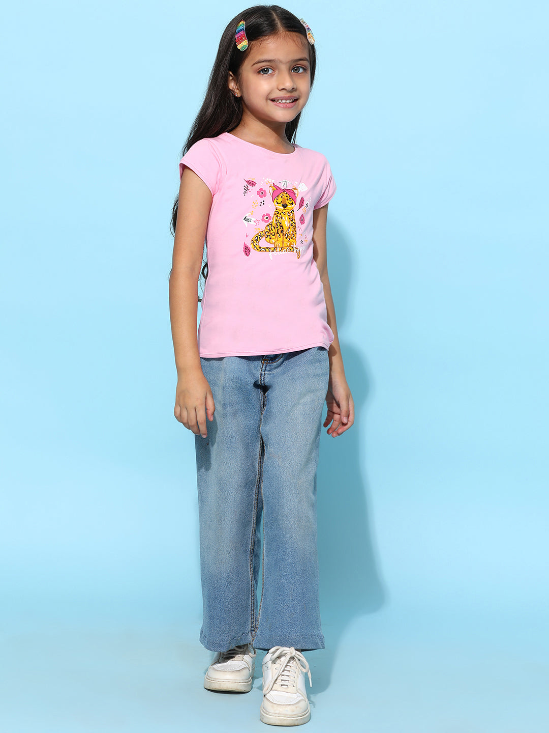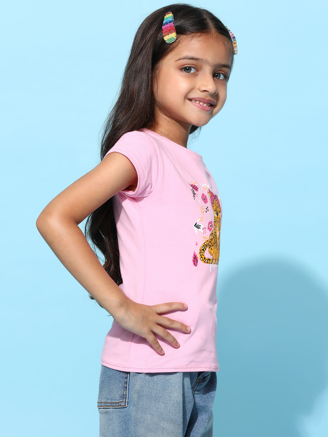 Girls Light Pink Lycra Printed Regular Fit T-shirt