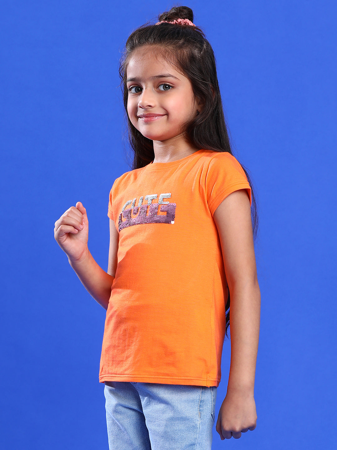 Girls Printed Orange Cotton Regular Fit T-Shirts
