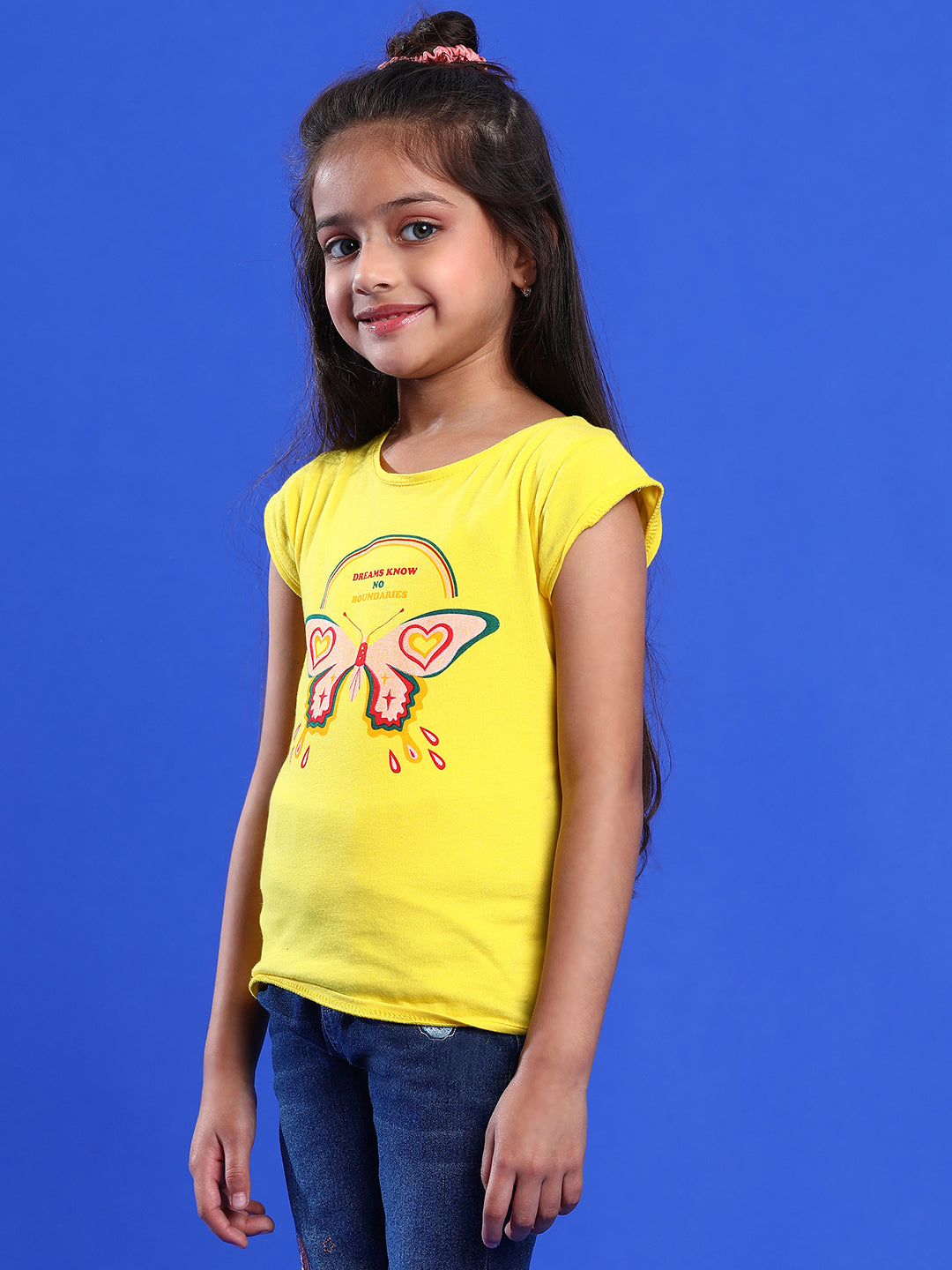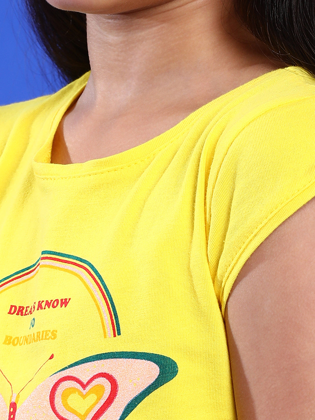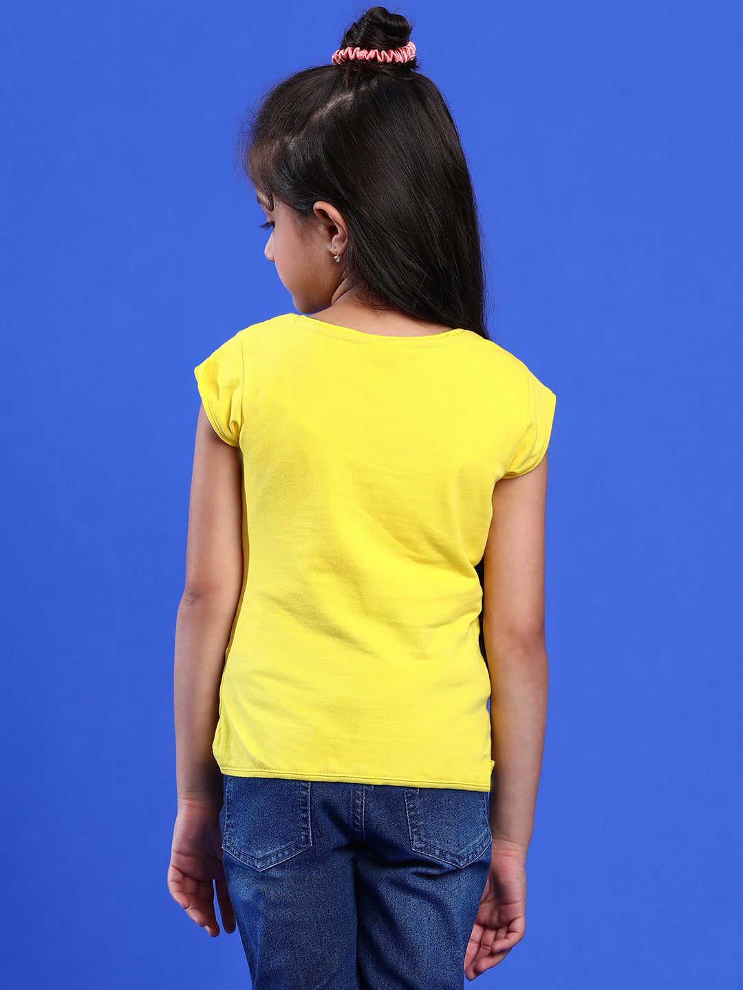 Girls Printed Yellow Cotton Regular Fit T-Shirts