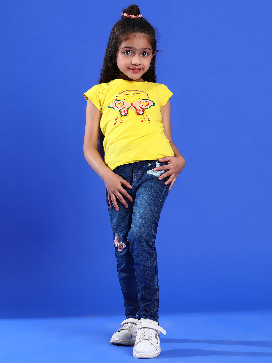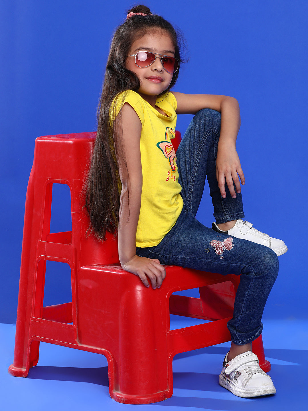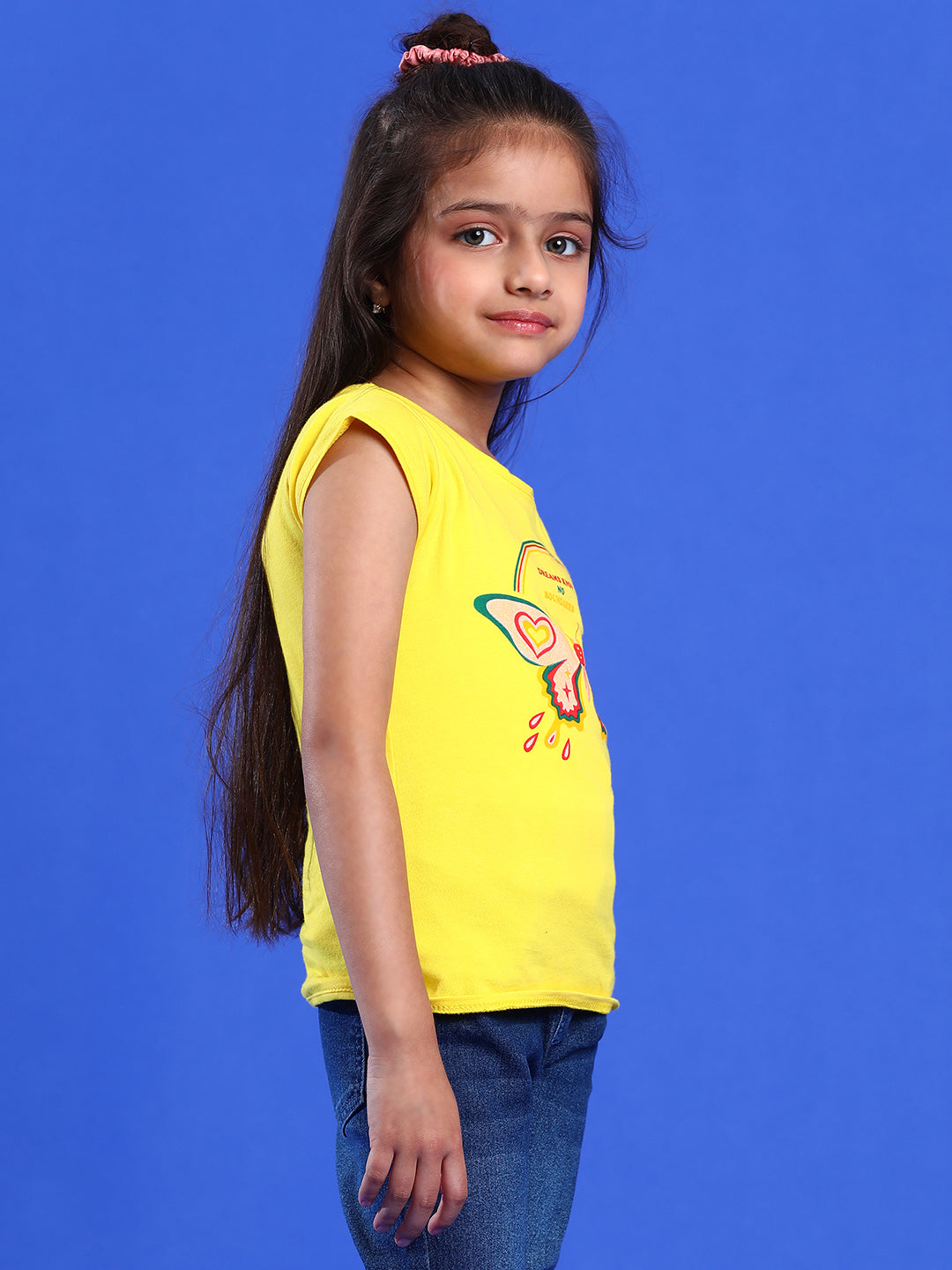 Girls Printed Yellow Cotton Regular Fit T-Shirts