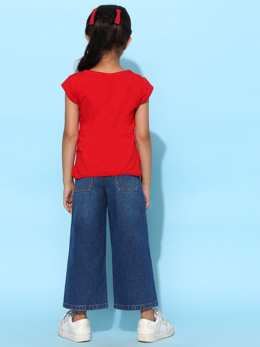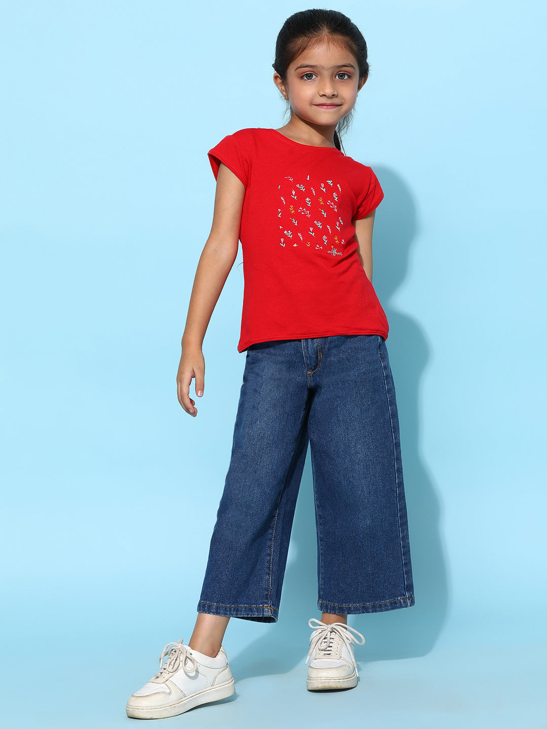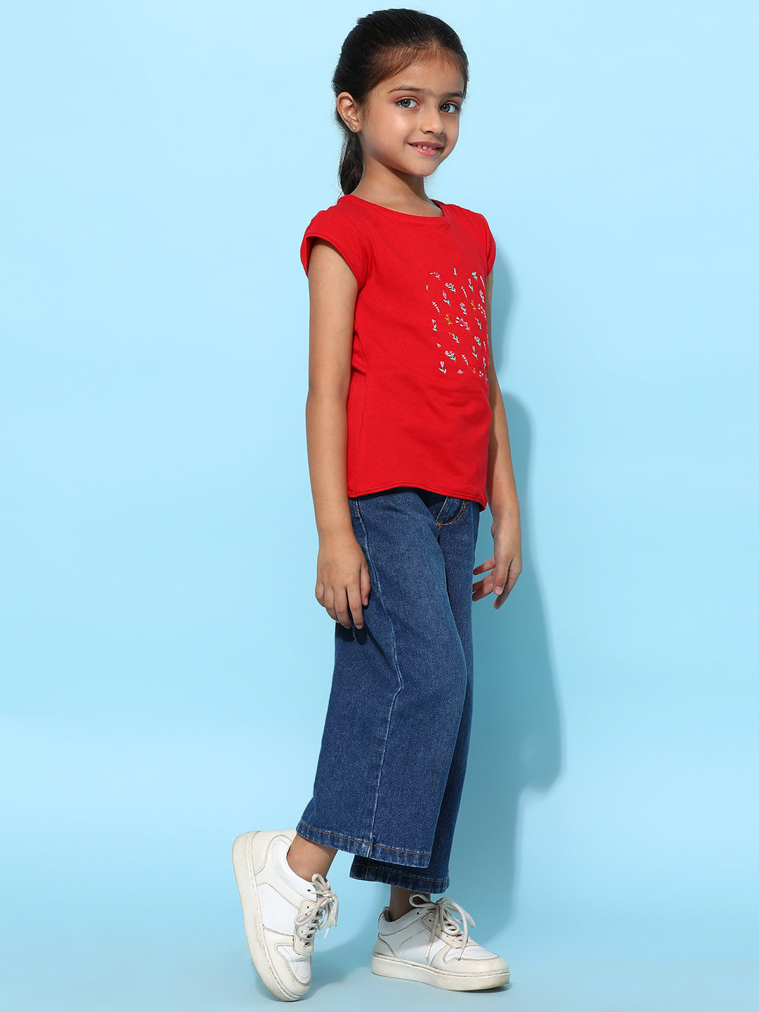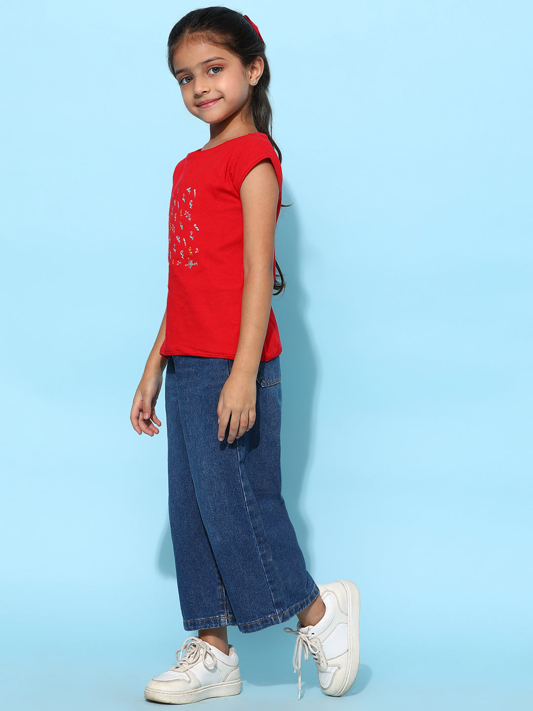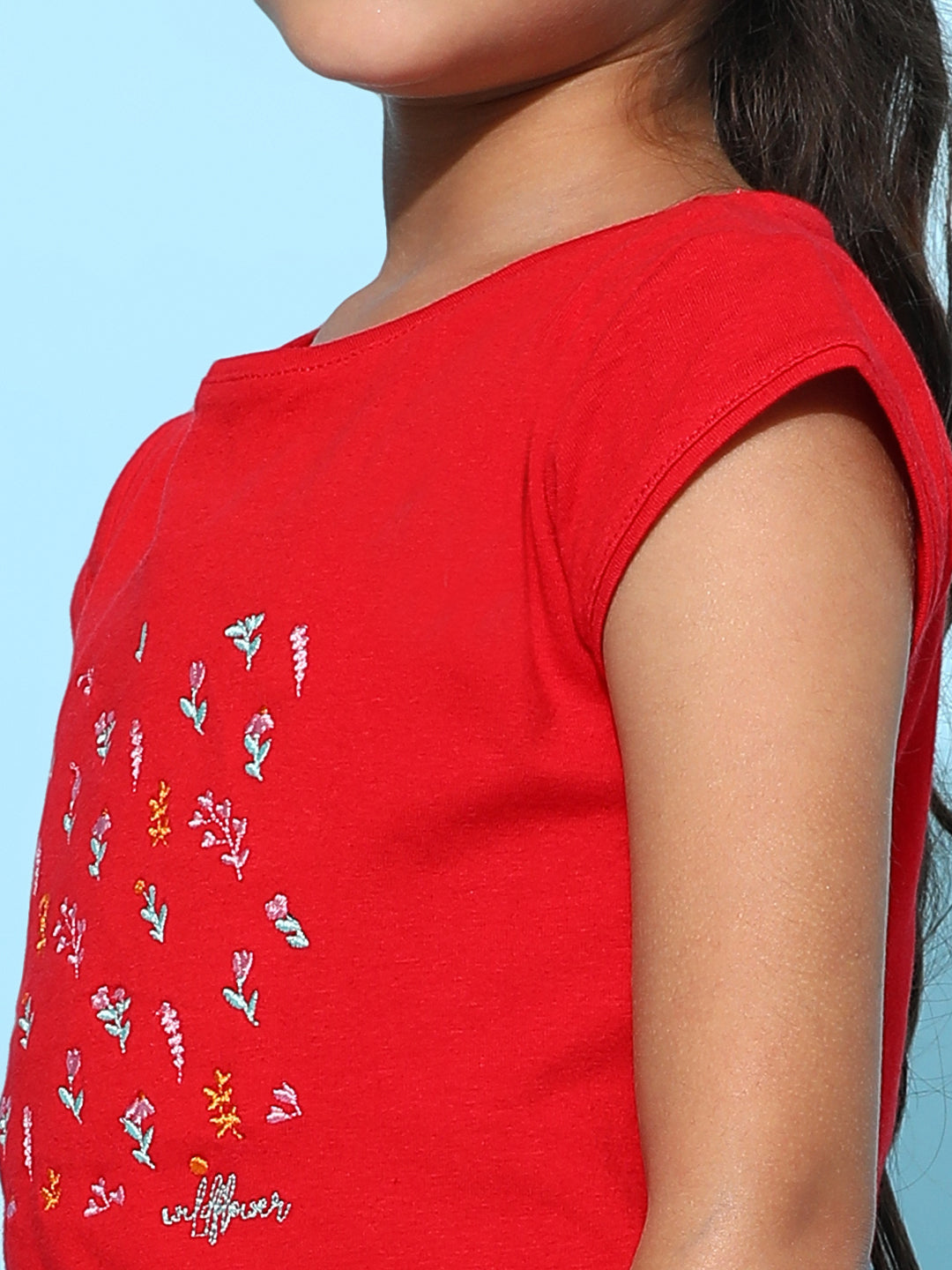 Girls Red Lycra Embroidered Regular Fit T-shirt