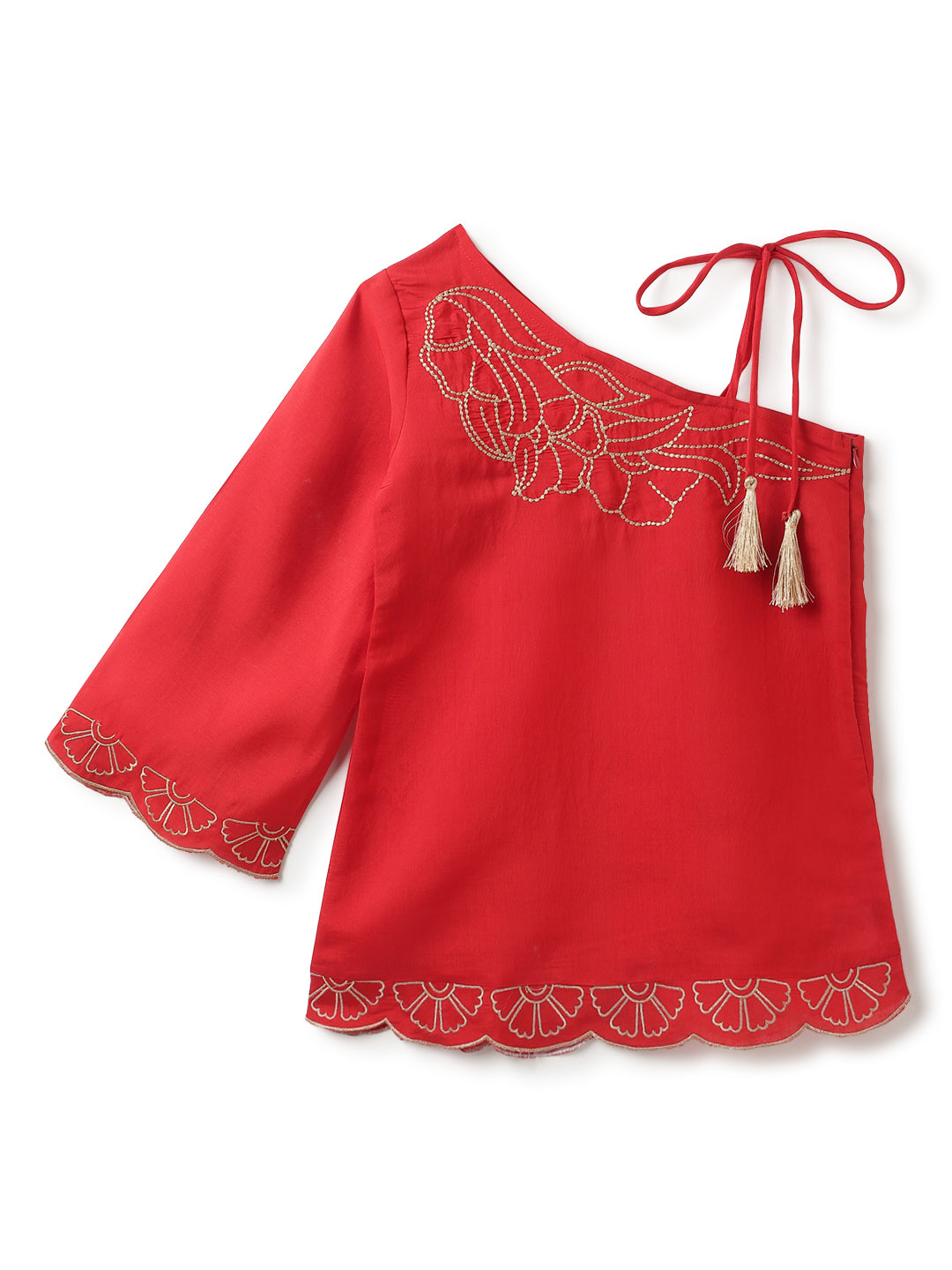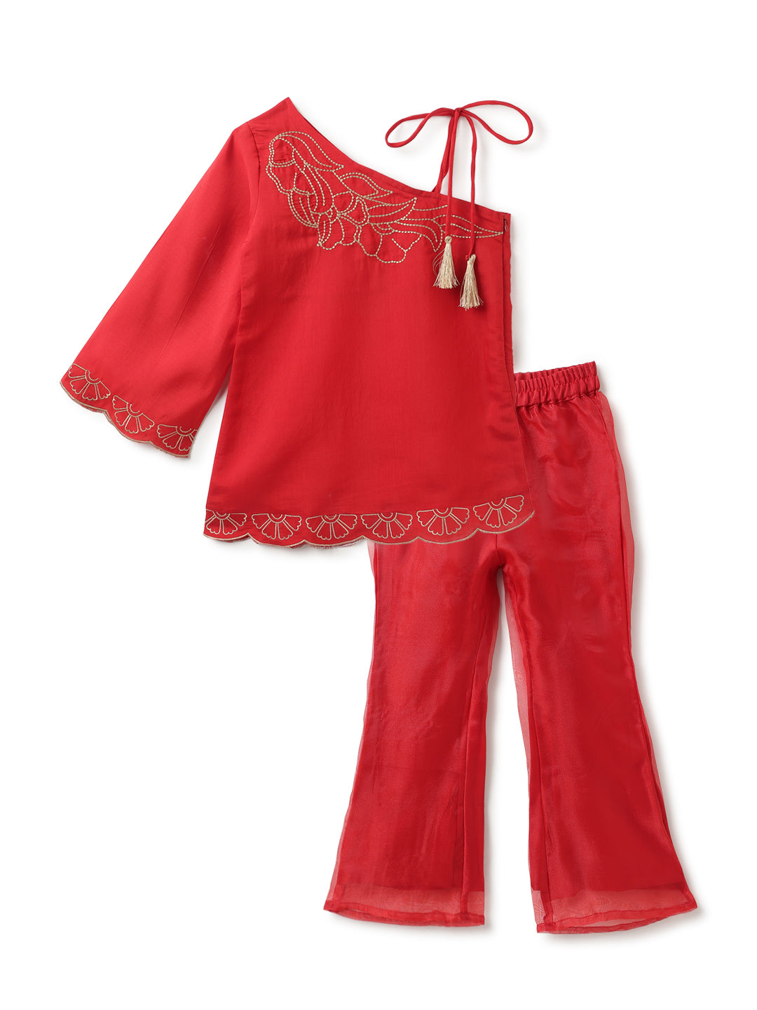 Girls Red Ethnic One Shoulder Top & Pant Set