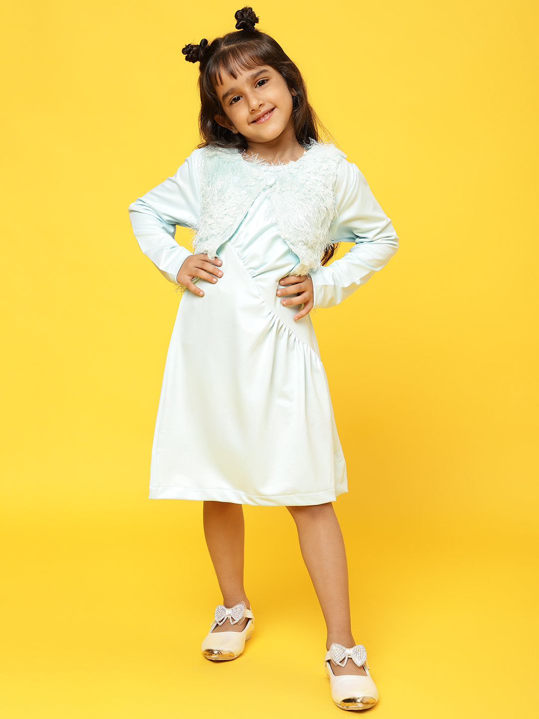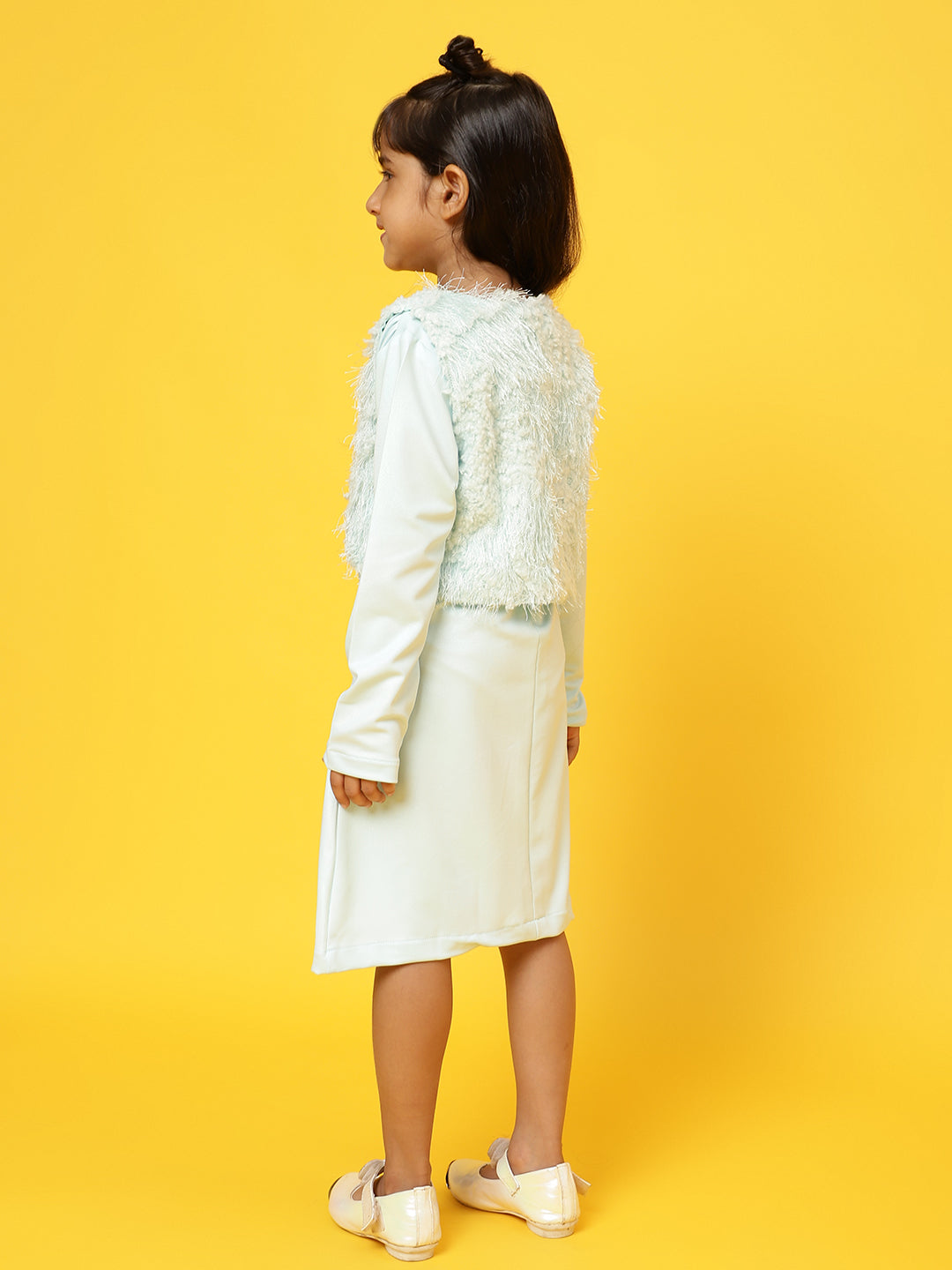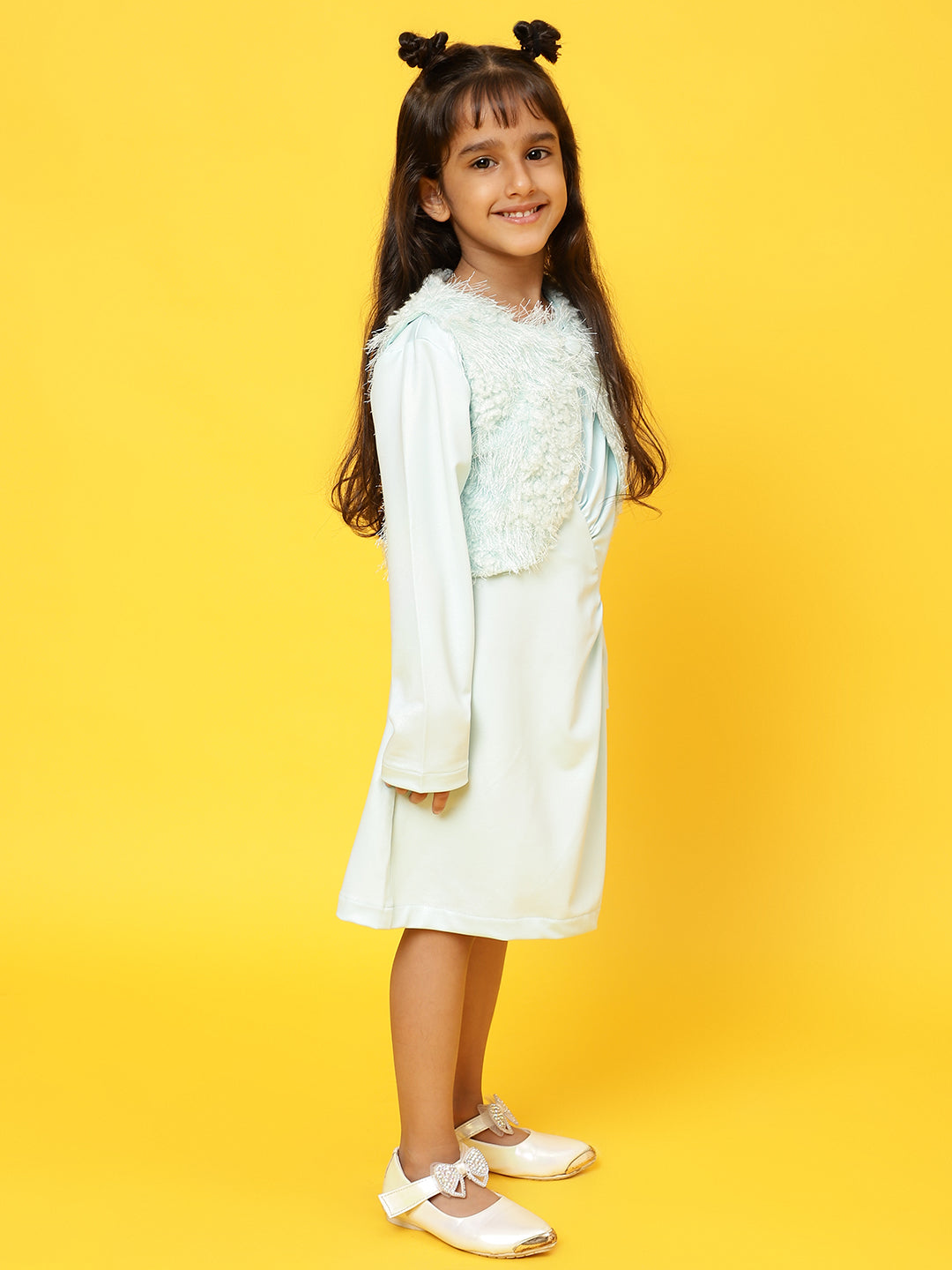 Girls Sky Blue Full sleeves Solid Dress with Jacket