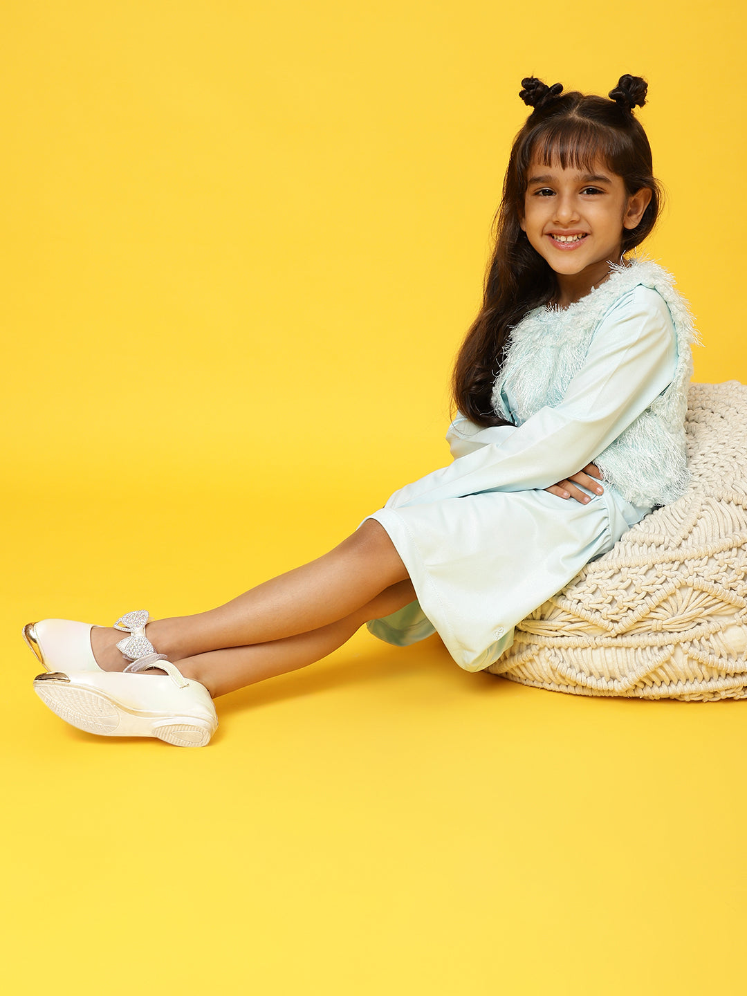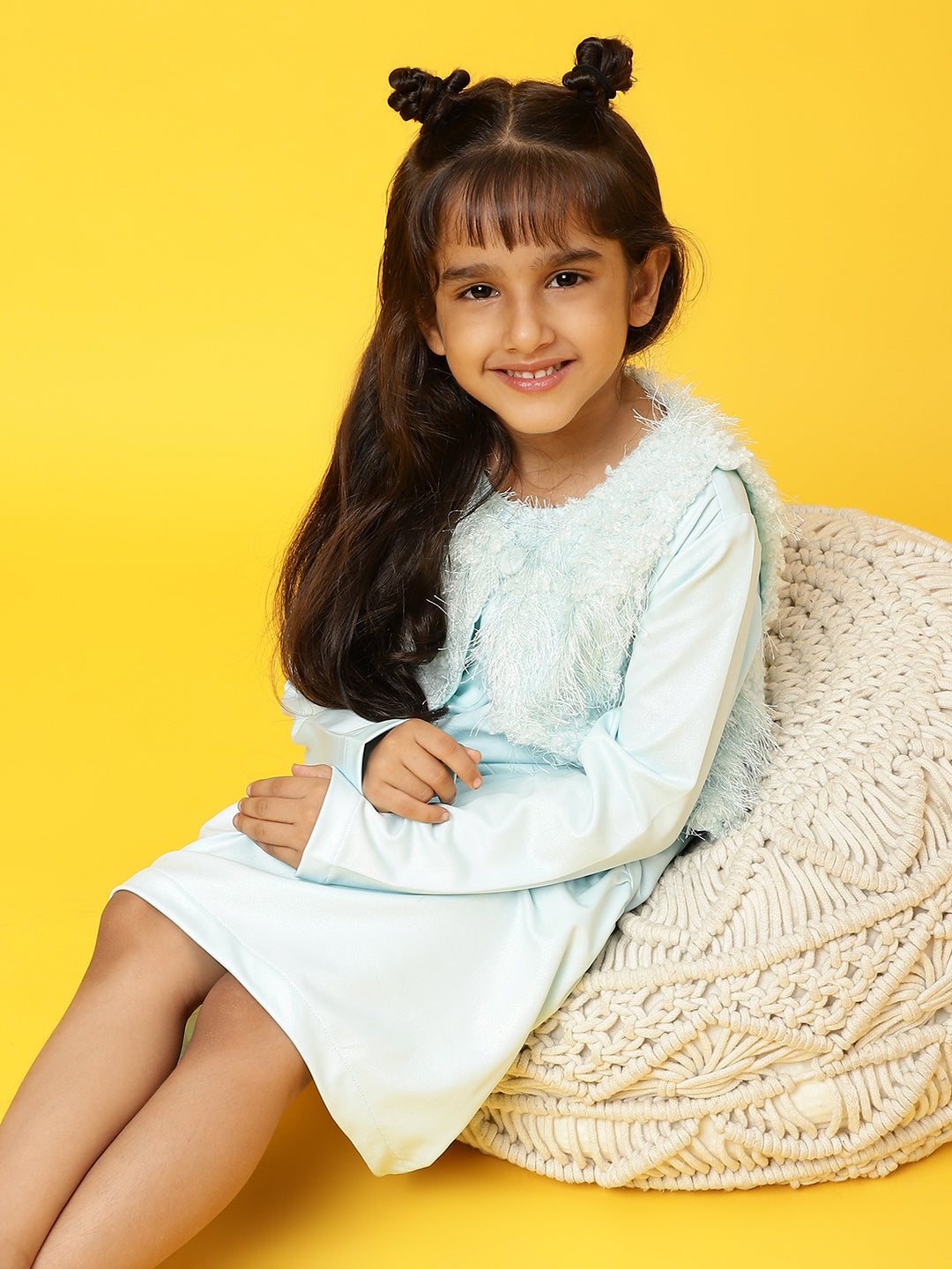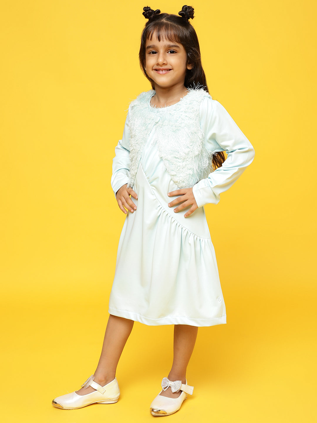 Girls Sky Blue Full sleeves Solid Dress with Jacket