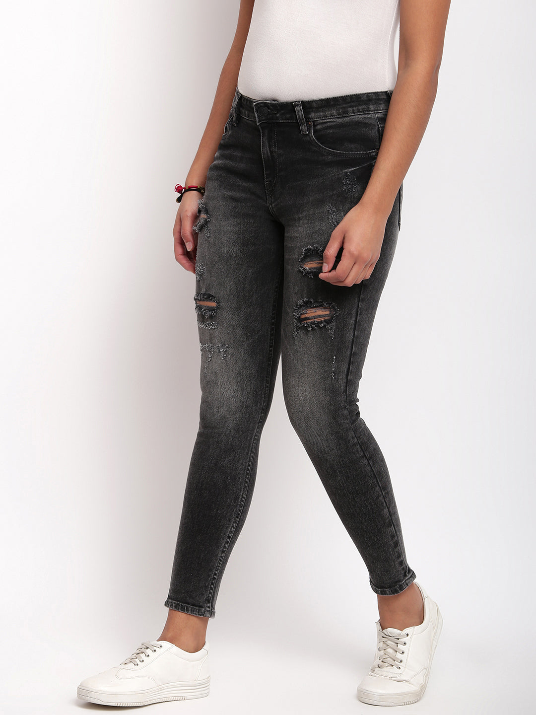 Women Black Mid Waist Skinny Fit Distressed Denim Jeans